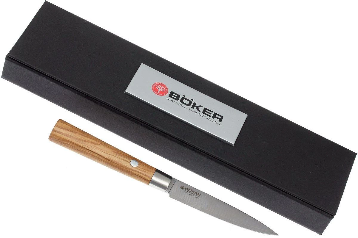 La colección Böker Damast Olive representa la calidad y la elegancia, con un toque multicultural. Los mangos se fabrican a partir de la preciosa madera de olivos del Mediterráneo. Esta madera tiene un bonito dibujo e incluso sigue oliendo a olivas. El impresionante patrón de esta madera luce muy bien con la delgada hoja de acero de damasco con núcleo de acero japonés VG10. El filo es muy afilado, al estilo japonés. Los cuchillos de esta colección no pesan casi nada. Por ello, el uso a largo plazo también será una gran experiencia. Las formas y la ausencia de la virola forjada parecen muy japonesas. Si se combinan estos impresionantes materiales y estilos con la artesanía alemana de Solingen, se obtienen estos increíbles cuchillos.