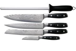 El juego de cuchillos de 6 unidades Eden Classic Damast, que incluye un bloque de cuchillos, te proporciona todos los cuchillos de cocina que necesitas. Es el juego básico perfecto, que permite realizar cualquier tarea de corte.