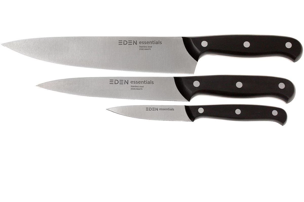 El cuchillo de chef, el cuchillo universal y el cuchillo pelador de Eden Essentials son el trÃo perfecto para prácticamente cualquier reto de pelado o corte. El cuchillo de chef puede acabar con casi todo. El cuchillo universal se puede utilizar cuando el cuchillo de chef resulta demasiado grande. Y el cuchillo pelador para cuando se trata de trabajos precisos. Con este juego de cuchillos tendrás todo lo que necesitas para cada tarea de corte y pelado.