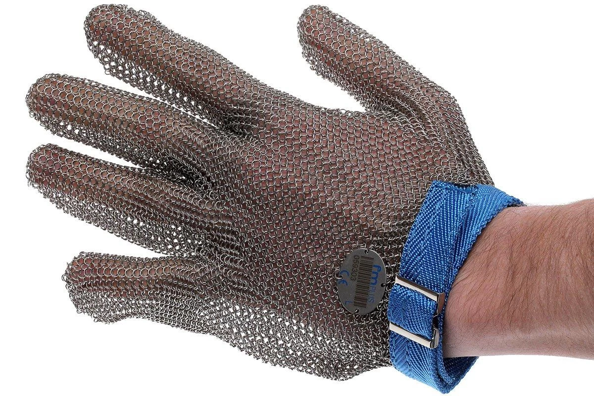 Este guante para ostras Niroflex reduce en gran medida el riesgo de lesiones al abrir las ostras. La estructura de los anillos de acero trenzado procede directamente de la cota de malla, pero obviamente es mucho más ligera y fina. Puedes ajustar la longitud de la banda sólida alrededor de la muñeca.
