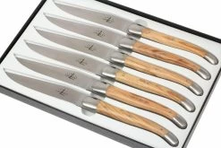 Este juego de cuchillos de mesa de Forge de Laguiole consta de seis hermosos cuchillos hechos a mano. Las hojas tienen un núcleo de acero inoxidable francés que está muy afilado y conserva su filo durante mucho tiempo. Los mangos de madera de olivo irradian lujo y están equipados con la característica cruz de pastor en forma de siete remaches. Por supuesto, la abejita típica de Laguiole también se encuentra en el reverso de las hojas.
