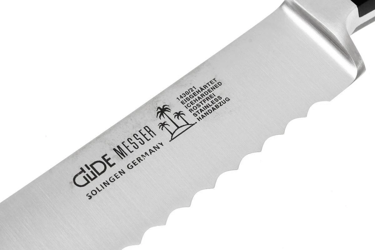 Cuchillo para pan de la colección Alpha de Güde. En la filosofía de Güde, un cuchillo de pan debe cortar el pan y no aplastarlo. Para ello, desarrollaron su propia versión de un cuchillo de sierra: el «Güde-Wellenschliff». En la práctica, esto resulta ser una mejora exitosa de la que se pueden encontrar muchas historias entusiastas.