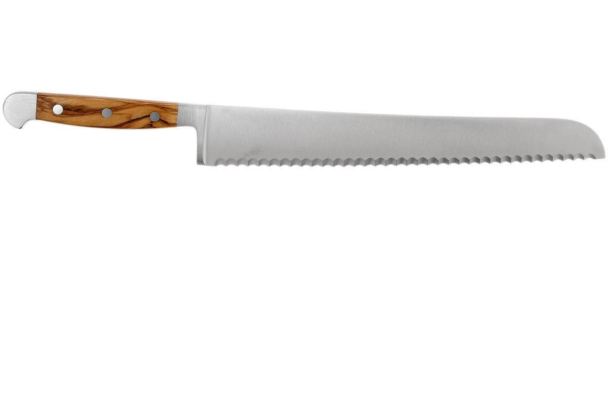 Puedes cortar todo tipo de pan con este cuchillo de pan de la colección Güde Alpha Olive. Este cuchillo de pan está mejorado con una hoja dentada de 32 cm y puede cortar todo tipo de panes, pasteles o tartas. Según la filosofía de Güde, un cuchillo de pan debe cortar el pan y no aplastarlo. Para ello, desarrollaron su propia versión de un cuchillo dentado: «Güde-Wellenschliff». El resultado es una mejora exitosa que muchos prefieren.