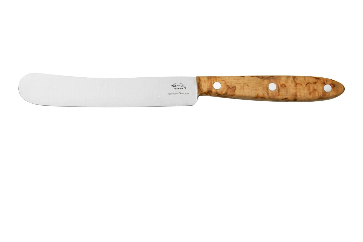 El cuchillo de mesa Otter Curly Birch es perfecto para untar mantequilla, mermelada y otros sabrosos untables en su sándwich. La punta redondeada de la hoja hace que sea muy fácil extender de forma suave y uniforme las cremas para untar en los sándwiches. Con una longitud de hoja de 12,5 cm, el cuchillo también es perfecto para vaciar el interior de frascos o tarros. El cuchillo está afiladísimo, por lo que también es adecuado para cortar salchichas, queso y pan blando.