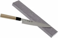 El cuchillo de chef de 21 cm de la colección Damasco de 45 capas de Sakai Takayuki. Este cuchillo de chef, también llamado gyuto, es el cuchillo de tamaño medio de los tres cuchillos de chef de la colección.