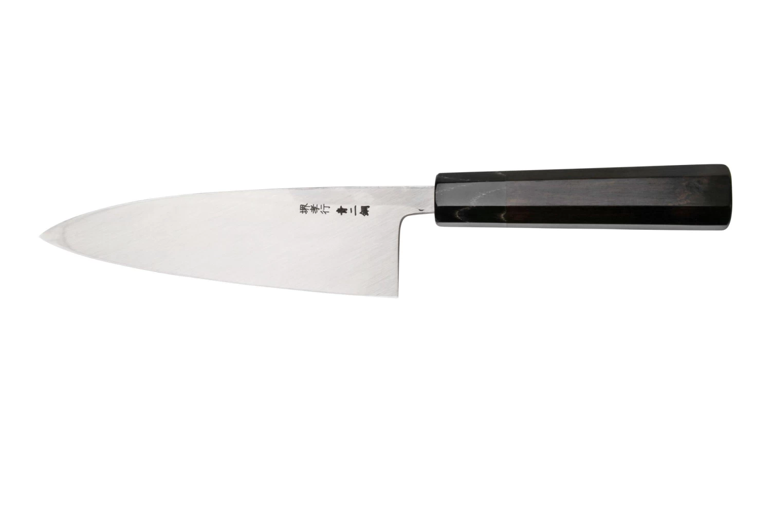 El Sakai Takayuki Blue 2 Steel Japanese Style 01237 deba 18 cm es un robusto cuchillo de cocina japonés. El deba fue diseñado originalmente para filetear y preparar carne y pescado. La hoja es más gruesa que la de un cuchillo de cocina medio, lo que te permite cortar huesos pequeños, ligamentos y tendones sin dañar el filo del cuchillo. Este cuchillo está afilado por un lado, mientras que el otro está ahuecado. Esto asegura que la carne o el pescado no se pegue y se caiga de la hoja con facilidad mientras estás cortando.