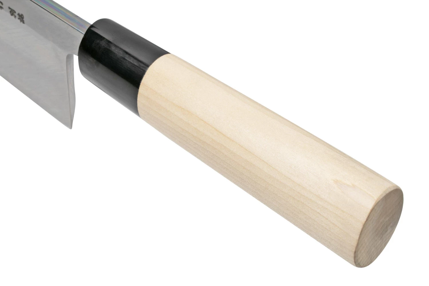 El Sakai Takayuki Tokujo 03039 deba ser un cuchillo de cocina japonés grande y sólido. El Deba fue diseñado originalmente para filetear y preparar carne y pescado. La hoja es más gruesa que la de un cuchillo de cocina medio, lo que te permite cortar huesos pequeños, ligamentos y tendones sin dañar el filo del cuchillo. Este cuchillo está afilado por un lado mientras que el otro está ahuecado. Esto asegura que la carne o el pescado no se pegue y se caiga de la hoja con facilidad mientras estás cortando.