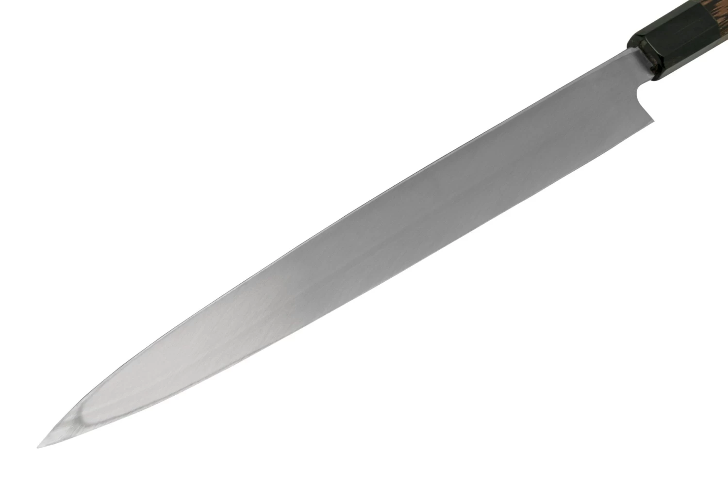 El Sakai Takayuki VG-10 Honyaki Shoryu 00202 yanagiba es un cuchillo de cocina de afilado unilateral con unas cualidades de corte inigualables. Gracias a la longitud de la hoja de 30, se pueden realizar movimientos de corte largos. Uno por cada rebanada. Esto te permite cortar rodajas extremadamente finas de carne, pescado o verduras. ¡Ideal para el sushi o el sashimi!