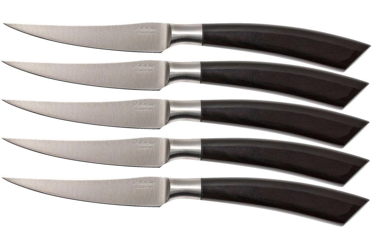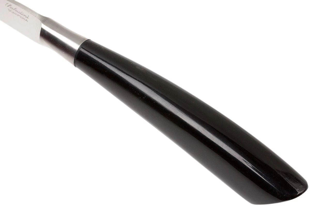 Con un juego de cuchillos para carne de Saladini introducirás en tu hogar herramientas de primera calidad. Este set contiene seis cuchillos para carne en una elegante caja de madera. Los cuchillos miden 23 cm de largo, con un mango de 10 cm y 13 cm de largo. Los mangos de este juego están hechos de cuerno de búfalo, lo que da un aspecto muy lujoso.
