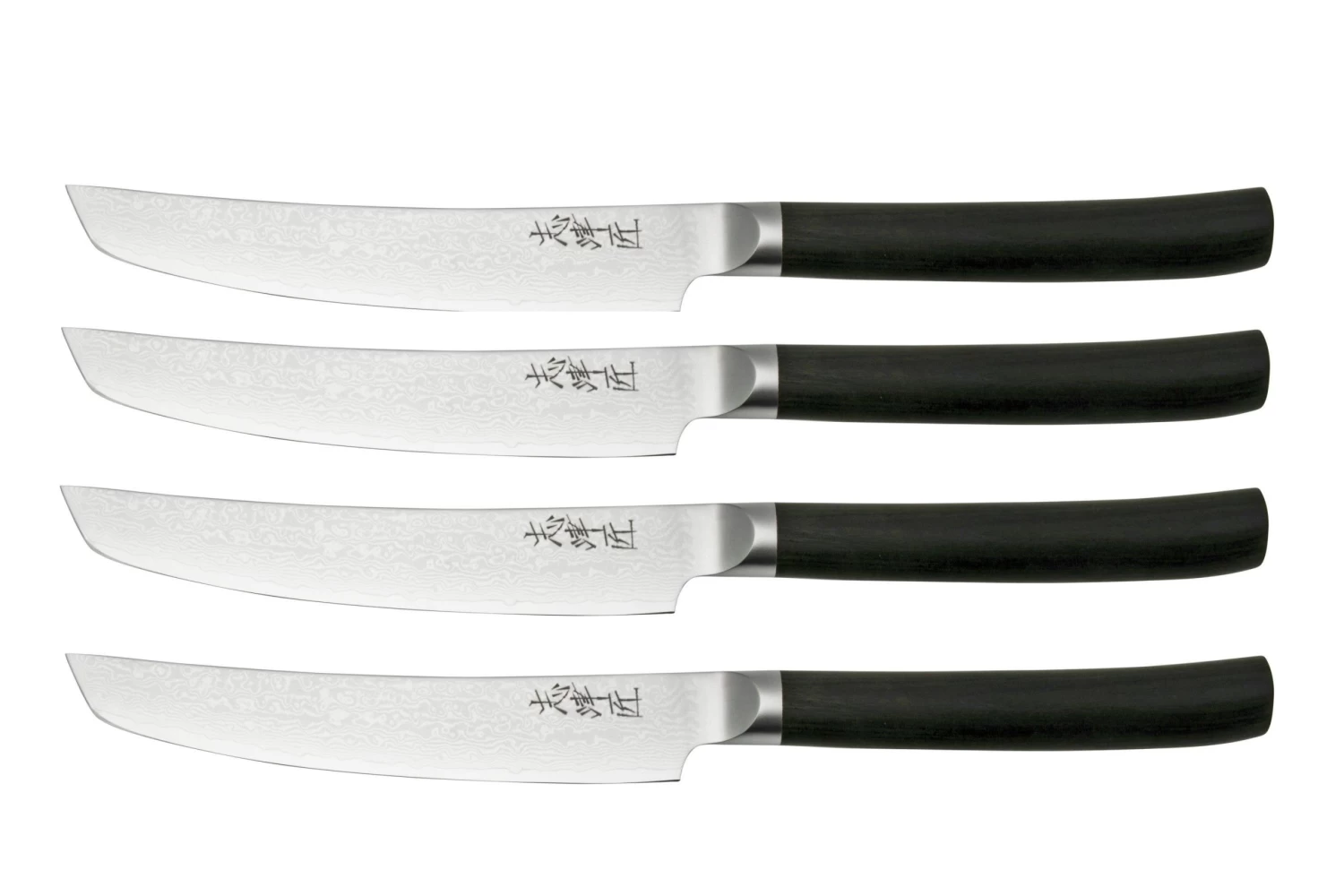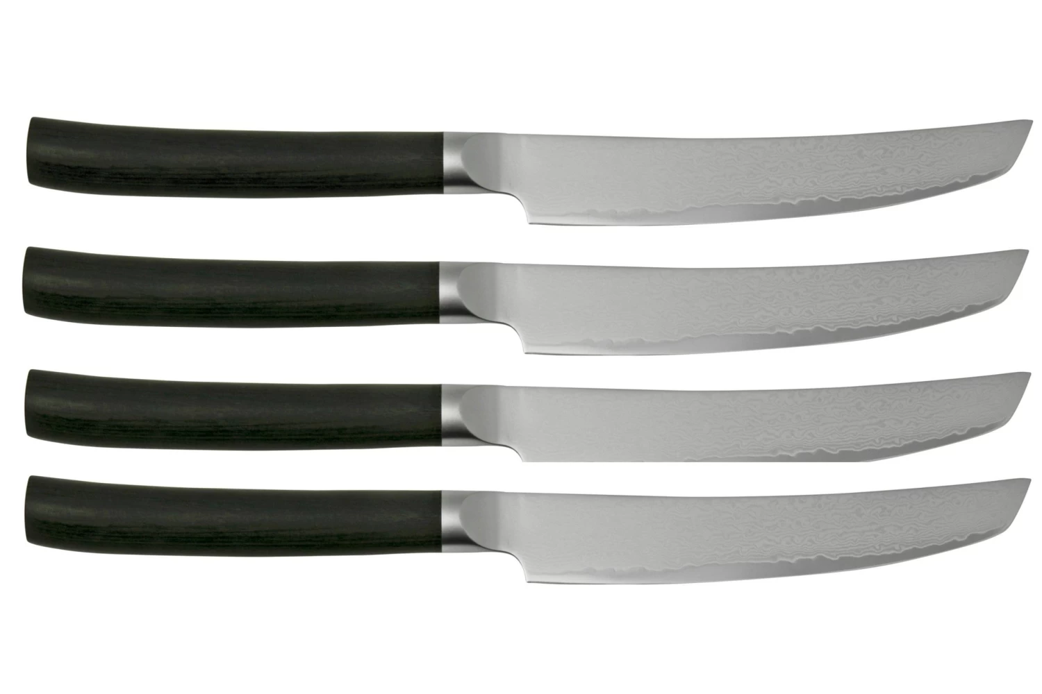 El Juego de cuchillos para carne de 4 piezas Shizu Hamono Takumi es un juego de cuchillos japoneses para carne chic y versátil. Gracias a su afilada hoja, podrás cortar filetes sin esfuerzo y sin desgarrar la carne, que permanecerá jugosa. Estos cuchillos se presentan en una bonita caja de madera de paulownia tomentosa.