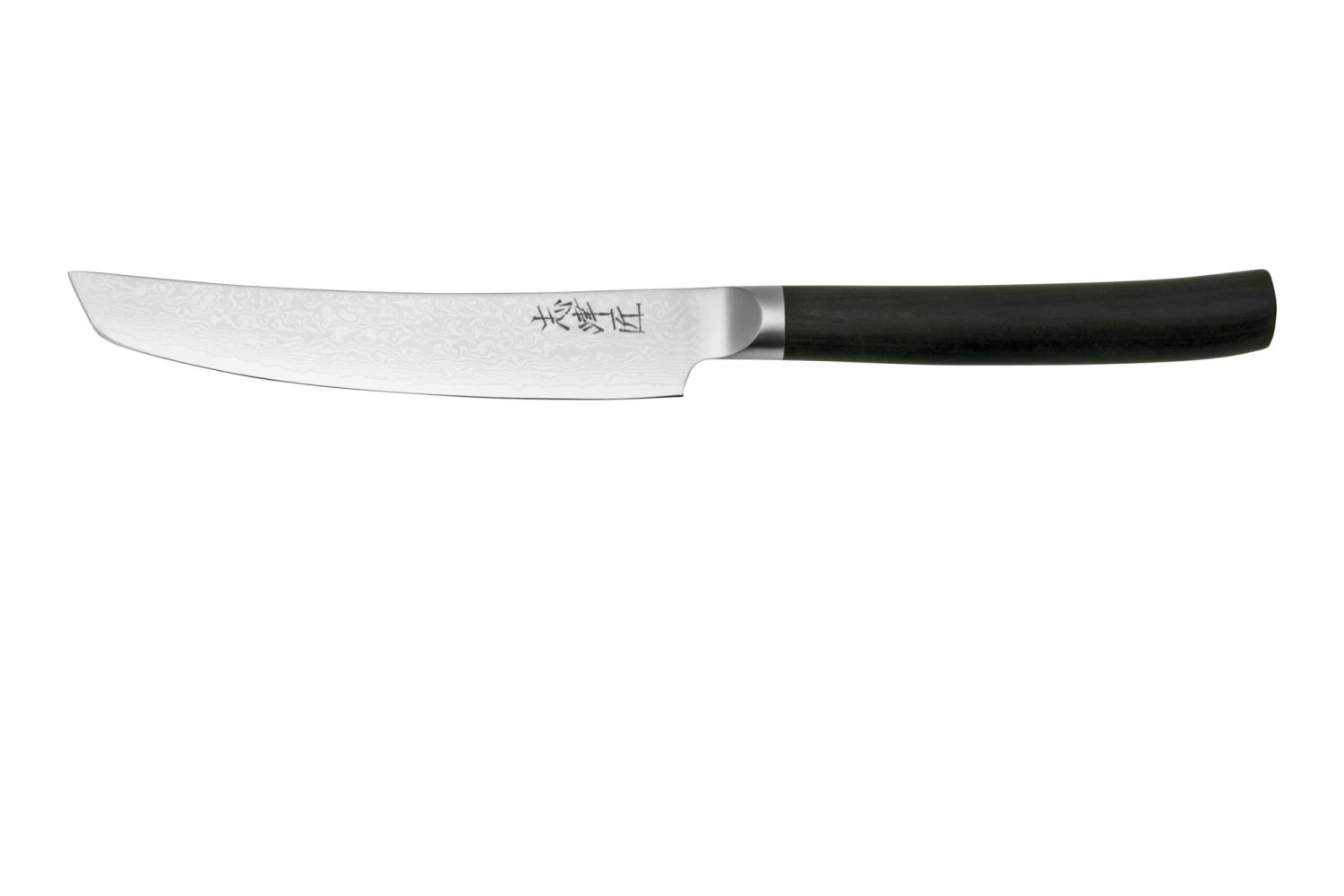 El cuchillo para carne Shizu Hamono Takumi es un elegante y versátil cuchillo japonés para carne. Gracias a su afilada hoja, podrás cortar filetes sin esfuerzo y sin desgarrar la carne, por lo que ésta se mantendrá jugosa. Además de para filetes, este cuchillo también es ideal como cuchillo de cocina pequeño. Se puede utilizar para cortar verduras, frutas y hierbas.