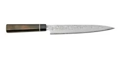 El cuchillo de sashimi Suncraft Senzo Black BD-07 de 21 cm es ideal para cortar pescado para sushi. La hoja está afilada por un lado, lo que le permite cortar finas lonchas de carne y pescado a gran velocidad.