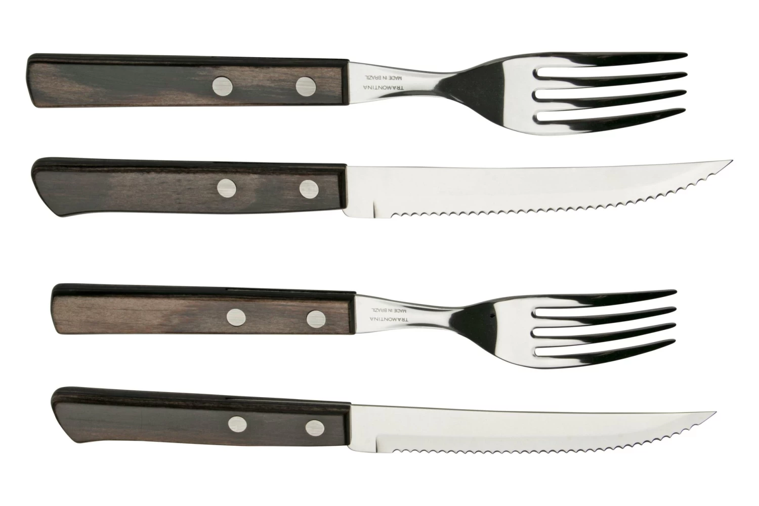 Este juego de cubiertos para carne y pizza de Tramontina Churrasco de 4 piezas es un juego económico y práctico, compuesto por dos cuchillos de mesa dentados y dos tenedores de mesa a juego. Adecuado para su uso en restaurantes o simplemente en casa. Gracias a las sierras puedes cortar fácilmente la corteza dura de una pizza recién horneada o un filete a la parrilla.