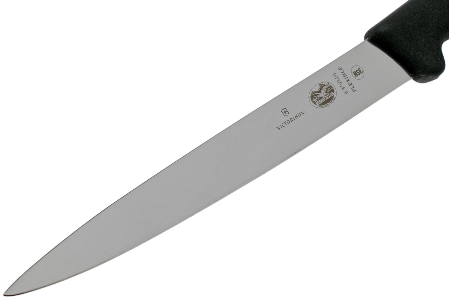 Este cuchillo para filetear Victorinox de la colección Fibrox tiene una hoja flexible de 20 cm. Este cuchillo es ideal para cortar rodajas finas de carne o pescado.