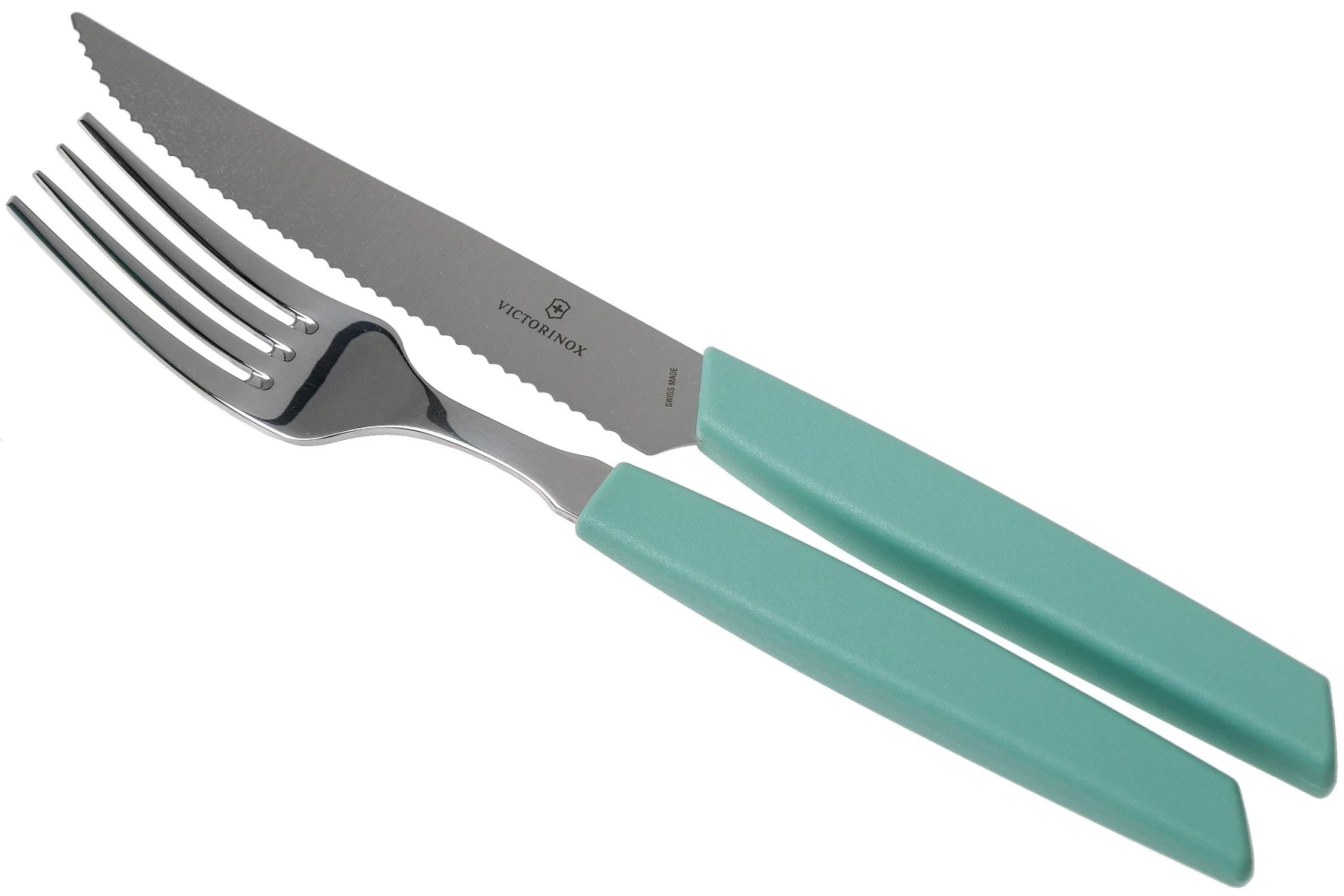 Prepara tu mesa con la cubertería verde Victorinox Swiss Modern de 12 piezas. Con los cuchillos para carne de este juego podrás cortar fácilmente tu filete o cualquier otro tipo de carne sin desgarrarla. De este modo, no se pierde humedad. También puedes utilizar los cuchillos de este juego para cortar verduras, pescado, pizza o pan. La hoja es dentada. Por ello, conserva su filo durante más tiempo que una hoja con un filo liso. Estos factores lo hacen perfecto para el uso diario.