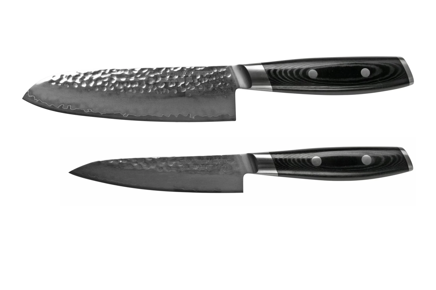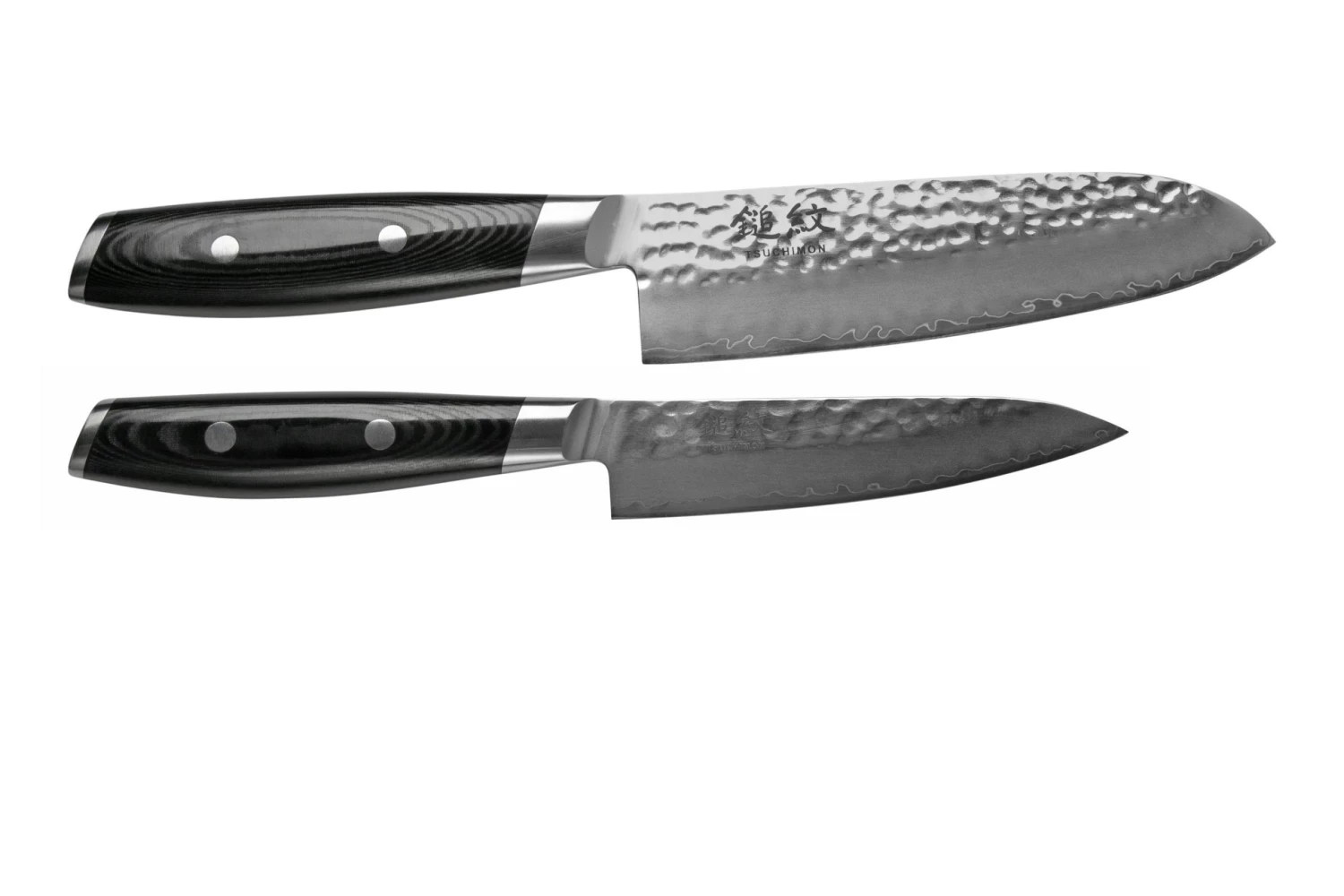 El Juego de regalo de 2 piezas Tsuchimon de Yaxell es un elegante set compuesto por un santoku para todas las tareas de corte más importantes del día a día, como picar un pimiento o una pechuga de pollo, y el pequeño y práctico cuchillo universal para picar finamente ingredientes como hierbas o ajo. Los cuchillos se entregan en una bonita caja de regalo de cartón negro.