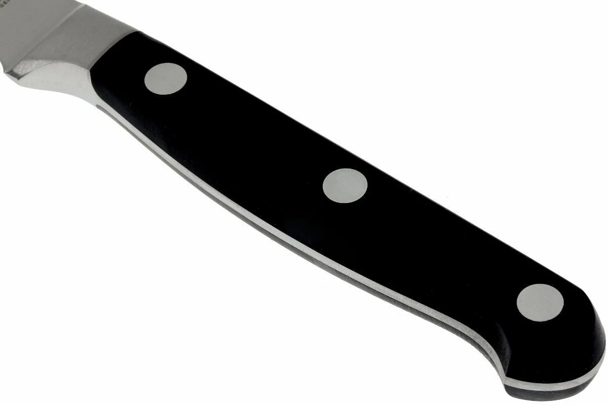 Los cuchillos de cocina Professional »S» de Zwilling destacan por su diseño tradicional de alta calidad. Están diseñados para cumplir con los estándares de calidad de los profesionales. La hoja está forjada de una sola pieza y atraviesa completamente el mango. Los tres remaches encajan perfectamente en los mangos de Novodur. Hace que sea agradable trabajar con ella y también garantiza una buena higiene.