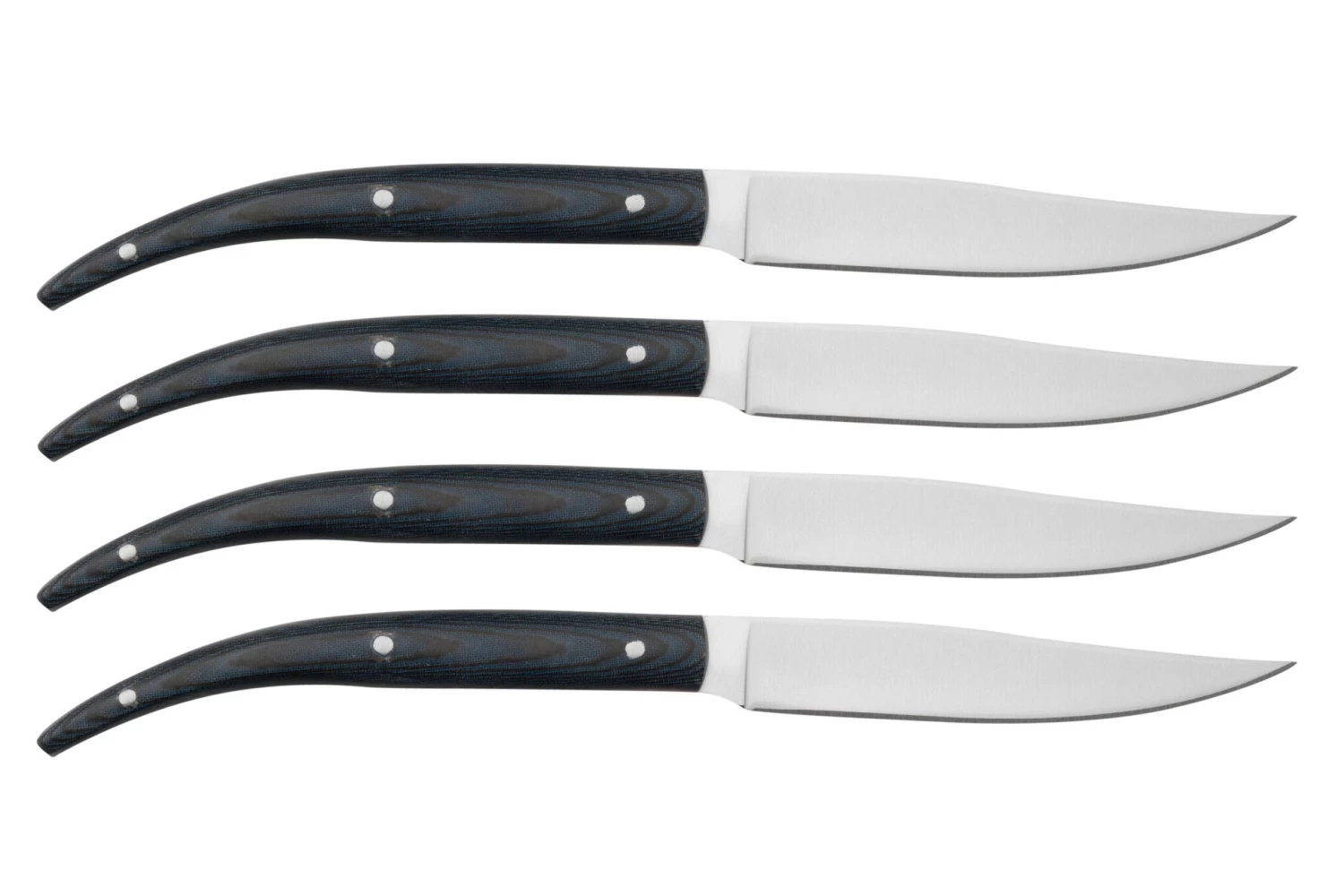 Este juego de cuchillos para carne de 4 piezas en micarta azul de Zwilling es un elegante y moderno juego de cuchillos para carne con un toque de historia. El diseño se basó en los cuchillos de carne del siglo XVIII de Albacete (España). Puede que el diseño sea clásico, pero el acero y el acabado garantizan niveles modernos de calidad.